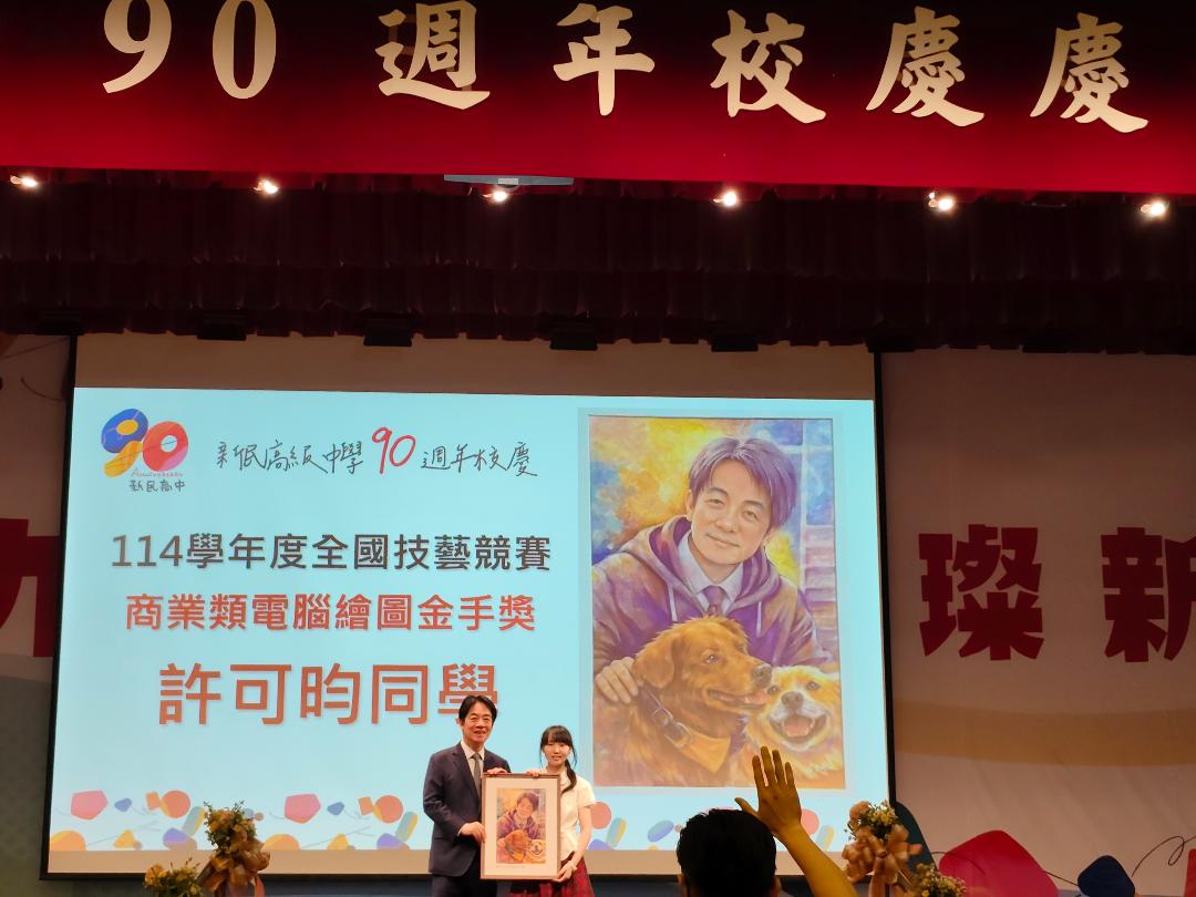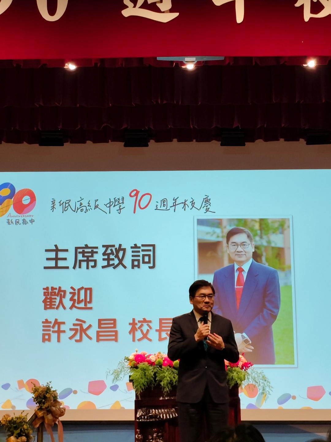 台中市私立新民高中今(18)日創校90週年校慶,台中市副市長黃國榮代表市長盧秀燕出席,與師生、校友及各界貴賓共同見證辦學成果;總統賴清德亦受邀到場同慶。市府表示,台中長期重視教育發展,透過公私協力培育多元人才,展現城市穩健的人才基礎與教育量能。賴清德總統表示,他的教育理念是希望用教育為孩子裝上飛向夢想的翅膀,政府的責任要做到「教育平權」,推動高中職免學費,不論公、私立高中職一律免學費,由教育部負擔。